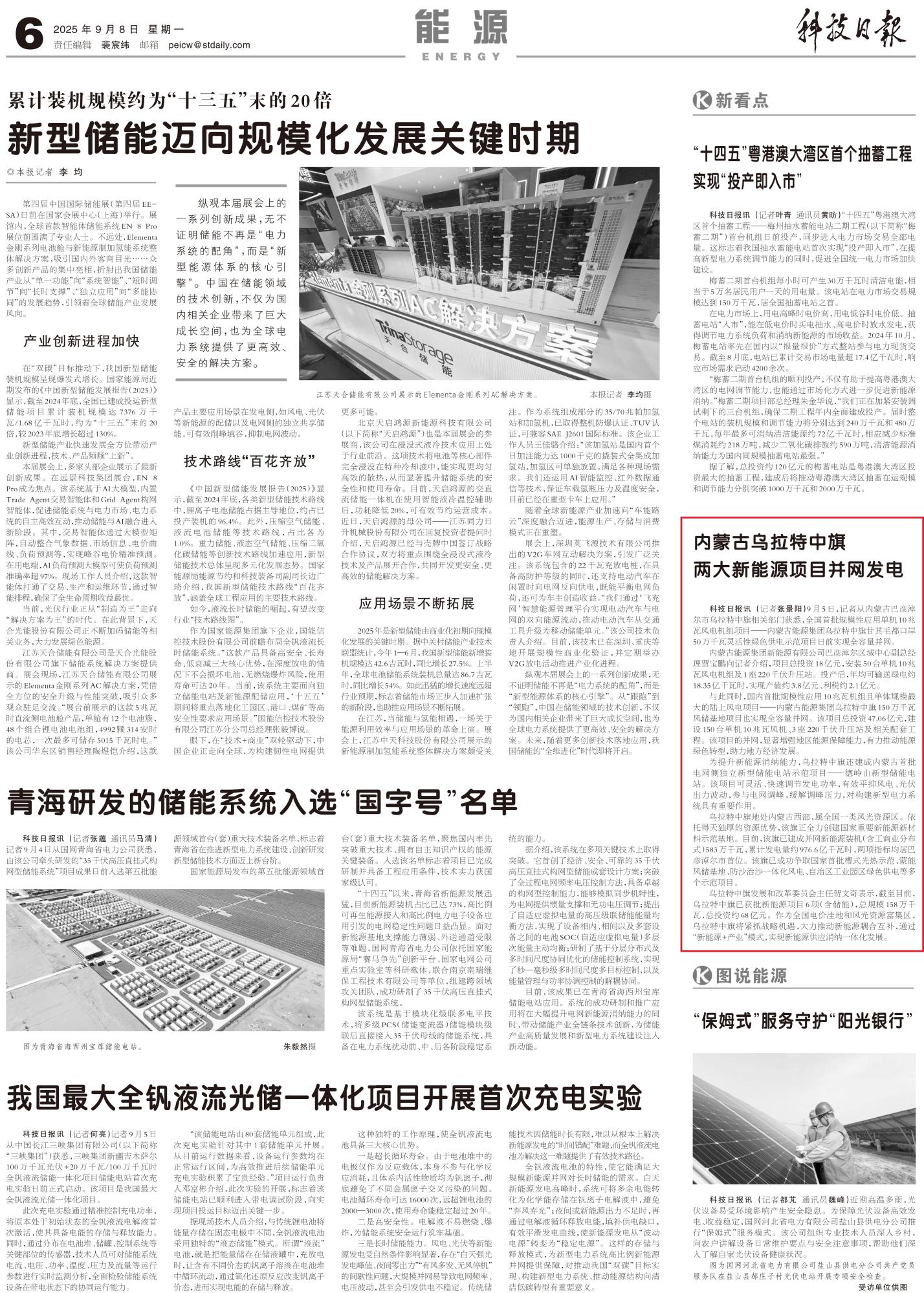 2025年9月8日,《科技日報》第6版整版刊發(fā)題為《內(nèi)蒙古烏拉特中旗兩大新能源項目并網(wǎng)發(fā)電》的文章,報道了記者從內(nèi)蒙古巴彥淖爾市烏拉特中旗相關(guān)部門獲悉,全國首批規(guī)模性應(yīng)用單機(jī)10兆瓦風(fēng)電機(jī)組項目——內(nèi)蒙古能源集團(tuán)烏拉特中旗甘其毛都口岸50萬千瓦靈活性綠色供電示范項目日前實現(xiàn)全容量并網(wǎng)。