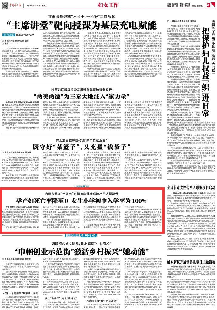 2025年11月18日《中國婦女報》第3版刊發(fā)了《內(nèi)蒙古通遼“十四五”時期婦幼健康保障水平大幅躍升 孕產(chǎn)婦死亡率降至0 女生小學初中入學率為100%》的文章,報道了近年來,通遼市婦幼健康保障水平大幅躍升,孕產(chǎn)婦死亡率降至0,嬰兒死亡率降至2.28‰。婦女“兩癌”篩查成效顯著,完成50萬人次免費篩查,1461名低收入患病婦女獲得全額救助。聯(lián)合醫(yī)療部門開展的講座和義診惠及10萬余名婦女群眾。