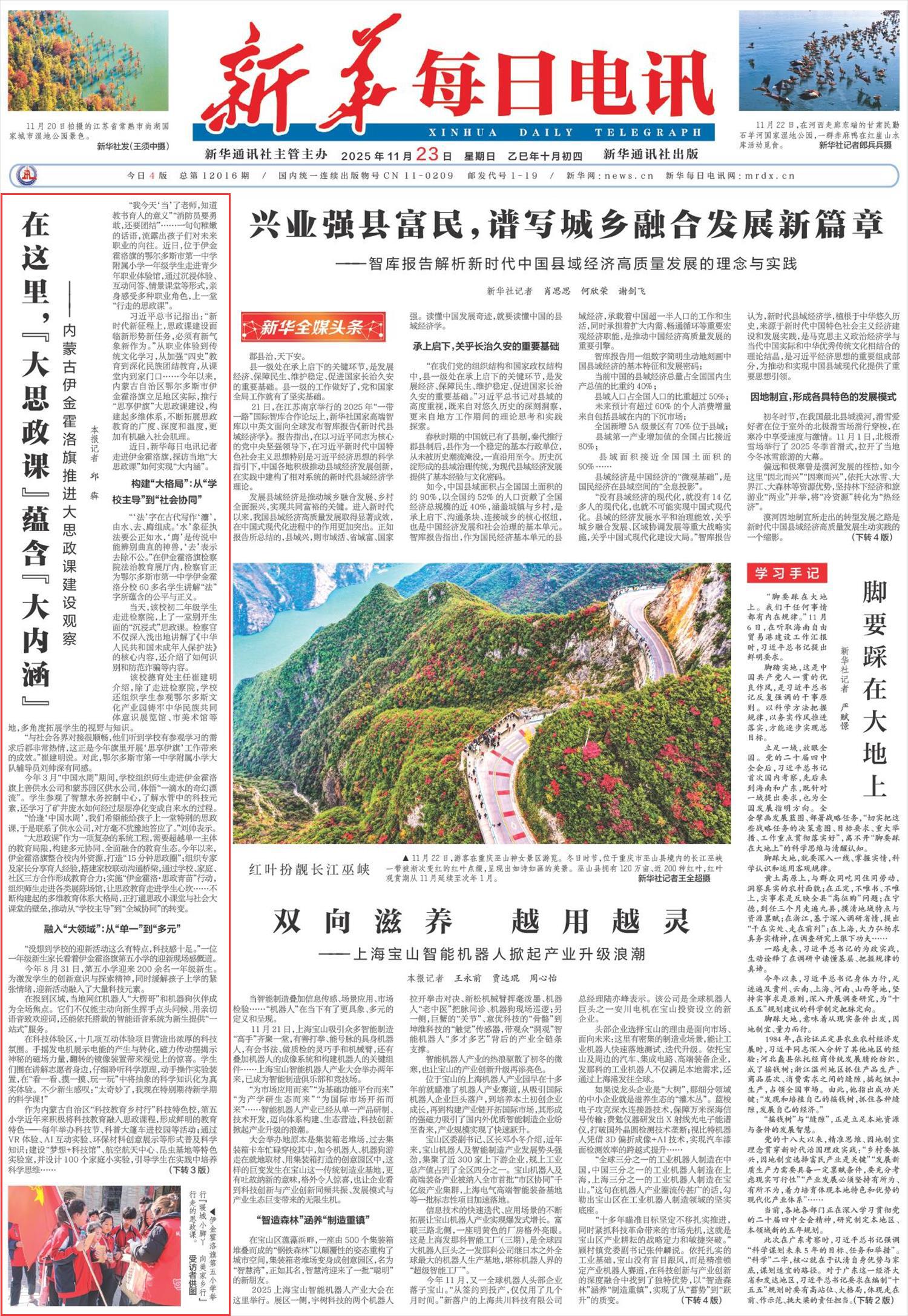 2025年11月23日,《新華每日電訊》頭版刊發(fā)題為《在這里,“大思政課”蘊(yùn)含“大內(nèi)涵”——內(nèi)蒙古伊金霍洛旗推進(jìn)大思政課建設(shè)觀察》的文章,報(bào)道了內(nèi)蒙古自治區(qū)鄂爾多斯市伊金霍洛旗立足地區(qū)實(shí)際,推行“思享伊旗”大思政課建設(shè),構(gòu)建起多維體系,不斷拓展思政教育的廣度、深度和溫度,更加有機(jī)融入社會(huì)肌理。
