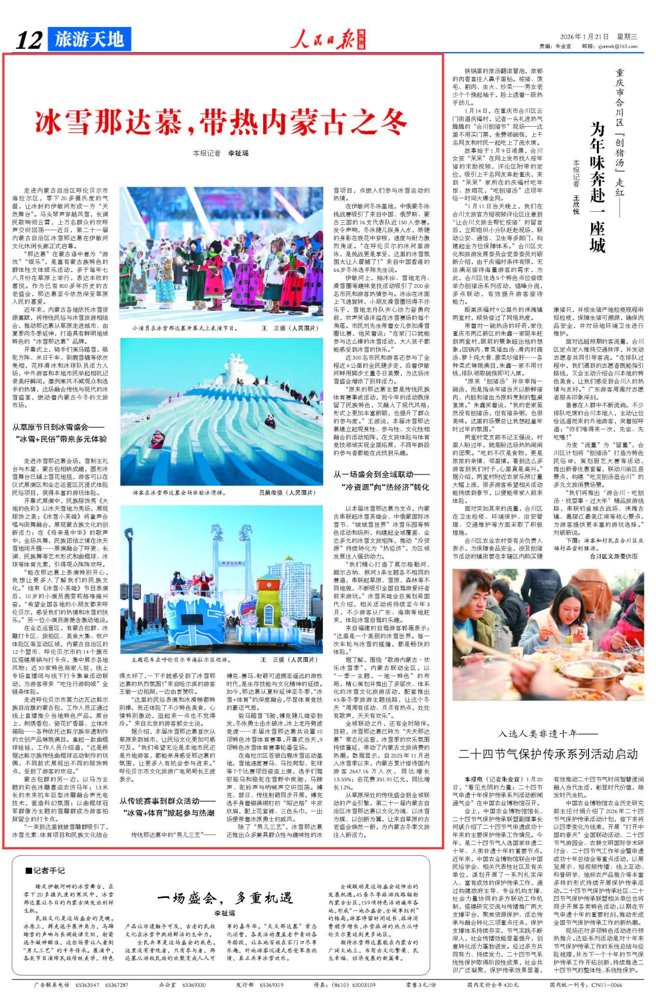 2026年1月21日《人民日報海外版》第12版刊發(fā)了《冰雪那達(dá)慕,帶熱內(nèi)蒙古之冬》的文章,報道了近年來,內(nèi)蒙古各地依托冰雪資源稟賦,將傳統(tǒng)民俗與冰雪旅游相結(jié)合,推動那達(dá)慕從草原走進(jìn)城市、由夏季向冬季延伸,打造具有鮮明地域特色的“冰雪那達(dá)慕”品牌,為內(nèi)蒙古冬季文旅注入新活力。