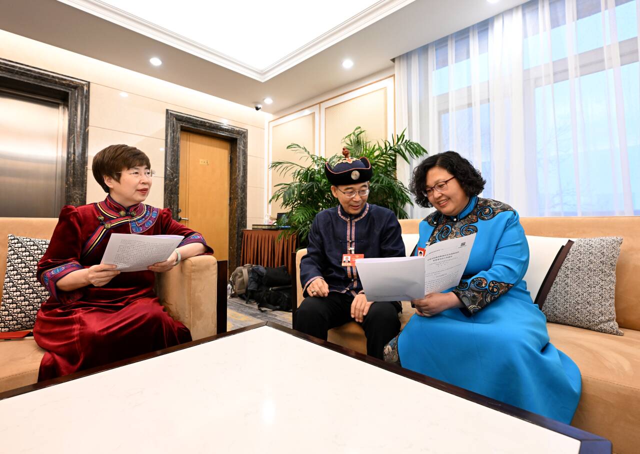 3月4日,住內蒙古全國政協(xié)委員杜明燕(右)、納日碧力戈(中)、鄂曉梅(左)就全國政協(xié)常委會工作報告中共同關注的話題進行交流。草原云記者 韓卿立