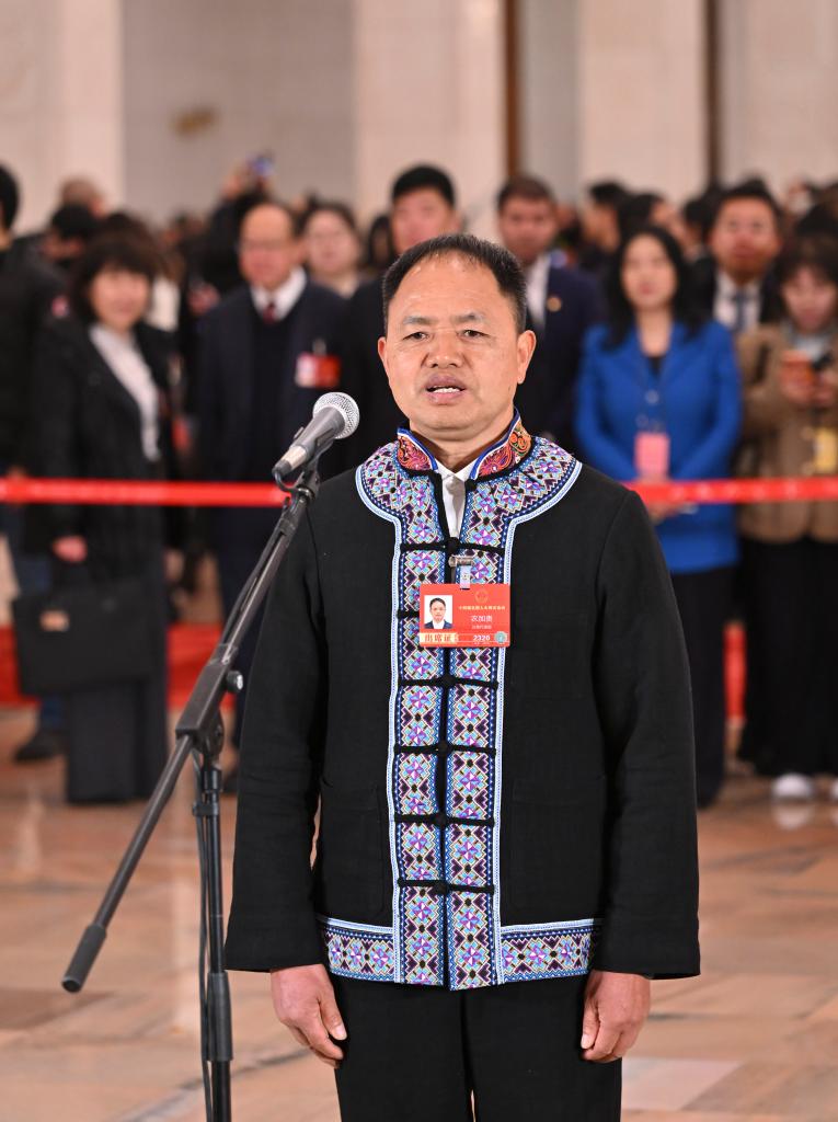 3月5日,第十四屆全國人民代表大會(huì)第四次會(huì)議首場“代表通道”集中采訪活動(dòng)在北京人民大會(huì)堂舉行。這是全國人大代表農(nóng)加貴接受媒體采訪。