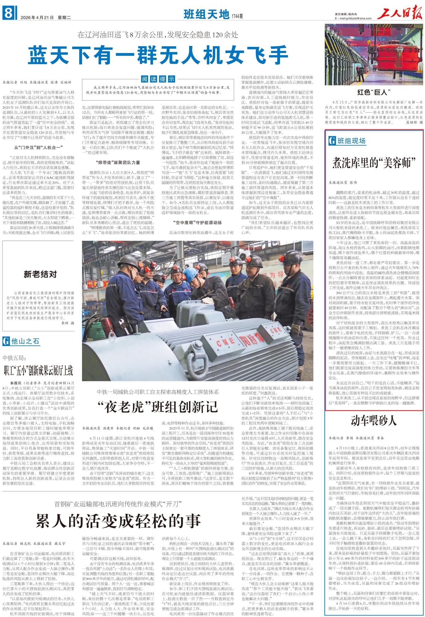 2026年4月21日,《工人日報》第8版刊發(fā)題為《煮洗庫里的“美容師”》的文章,報道了53歲的朱運達,是中國鐵路呼和浩特局集團有限公司大板機務(wù)段的煮洗工,煮洗工們從不曾出現(xiàn)在旅客的視野中,但這群幕后“美容師”,一直在默默守護鋼鐵巨龍的每一趟馳騁。