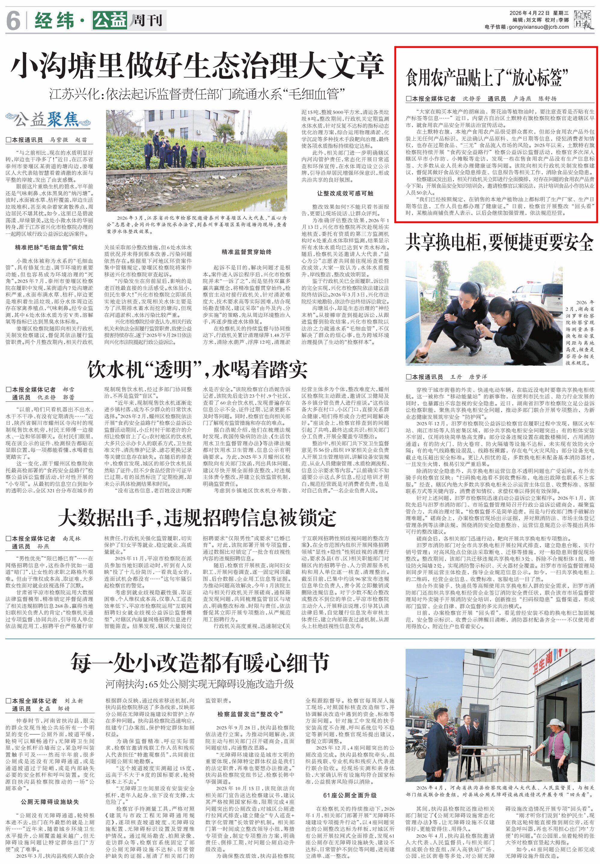 2026年4月22日,《檢察日?qǐng)?bào)》第6版刊發(fā)題為《食用農(nóng)產(chǎn)品貼上了“放心標(biāo)簽”》的文章,報(bào)道了內(nèi)蒙古自治區(qū)土默特右旗檢察院檢察官走進(jìn)轄區(qū)早市,就食用農(nóng)產(chǎn)品安全開展法治宣傳活動(dòng)。