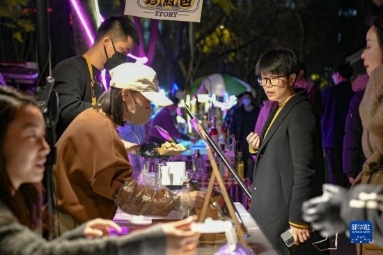 在四川省成都市錦江區(qū)三色路夜市,市民在購(gòu)買(mǎi)小吃(2月28日攝)。