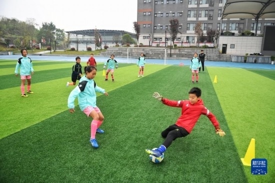 在瀘州天立春雨學(xué)校足球場(chǎng),來(lái)自涼山彝族自治州的舍布么扯鳩莫(前左)與男隊(duì)一起訓(xùn)練(3月29日攝)。