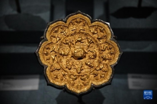 這是在西安博物院《長(zhǎng)安有故里——絲路少年大唐行》展覽上展出的金背瑞獸葡萄鏡(5月22日攝)。