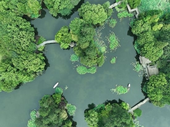 6月11日,游客在曲院風(fēng)荷景區(qū)欣賞荷花(無人機(jī)照片)。