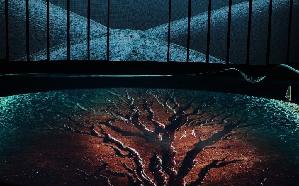 地屏上,交叉潮、一線潮、回頭潮、魚鱗潮等錢塘潮此起彼伏。這是寫實(shí)的潮,潮水的流動與翻涌都經(jīng)過精準(zhǔn)的“數(shù)字流體解算”技術(shù)計(jì)算,并進(jìn)行了超高比例的還原。“弄潮兒”乘著沖浪板匯入潮中,與浪潮起伏相呼應(yīng)。