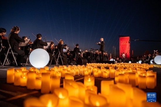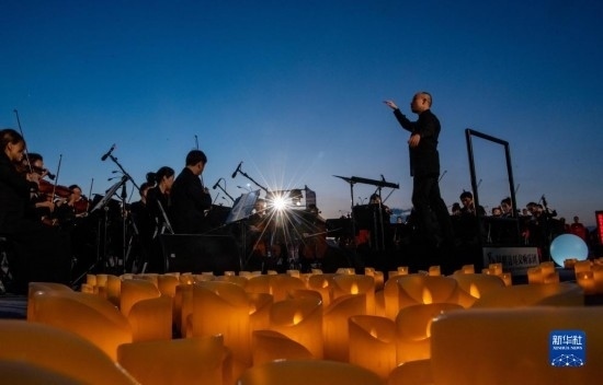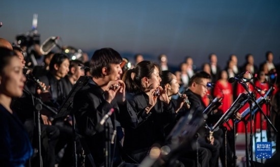 來自昆明聶耳交響樂團及昆明市民族歌舞劇院民樂團的演奏家們在昆明市滇池畔共同演奏包括《義勇軍進行曲》《賣報歌》在內(nèi)的聶耳代表作(7月17日攝)。