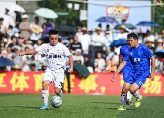 7月15日,六佰塘村足球隊(duì)球員楊宗維(左)在與月寨村足球隊(duì)的比賽中帶球進(jìn)攻。新華社記者 楊文斌 攝
