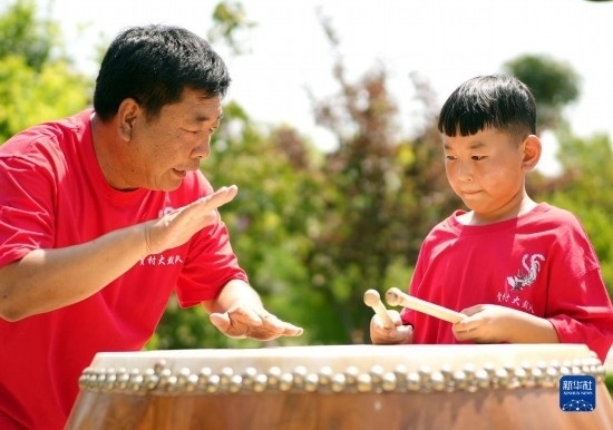 8月14日,在河北省滄州市滄縣舊州鎮(zhèn)賈村,大鼓藝人指導學生練習賈村大鼓。
