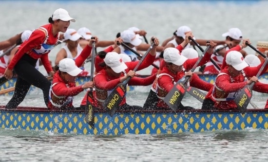 當天,溫州氣溫較前兩個比賽日有所降低,賽道上略有逆風。小組賽階段,中國男、女隊均位列小組第一,直接進入決賽。而未能直接晉級決賽的隊伍,要經過半決賽比拼,這對于龍舟長距離項目來說,隊員體力將經受考驗。