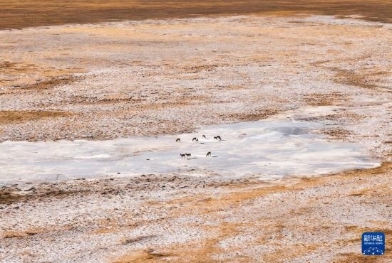 阿爾金山國家級自然保護(hù)區(qū),一群藏羚在冰河上(無人機(jī)照片,12月22日攝)。