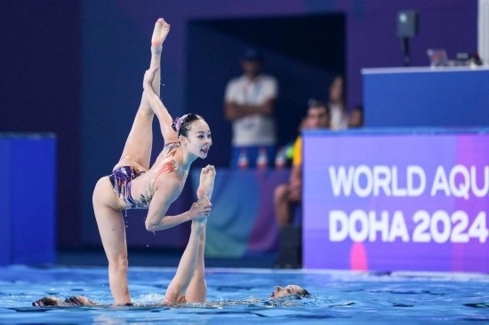 2月6日,中國隊(duì)教練張曉歡(左)、安娜在場邊觀賽。當(dāng)日,2024年世界游泳錦標(biāo)賽花樣游泳集體技術(shù)自選決賽在卡塔爾多哈舉行,中國隊(duì)獲得冠軍。新華社記者 夏一方 攝