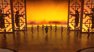 《詠春》來自舞劇《詠春》選段,已經(jīng)上演了百場,但在春晚是個特別的版本。為了創(chuàng)造出更加意蘊豐富的想象空間,總臺臺長慎海雄在推薦這個舞劇片段時,提出了幾個建議,包括演員服裝從黑色的香云紗改為絳紅色,男女主角之間的關(guān)系要從男主角一一過招“大敗”女主角改為相互切磋武藝,開場以男主角的武術(shù)剪影來增強吸引力,通過使用剪影效果來展現(xiàn)“葉問”的出場。當燈光亮起,窗欞上“詠春拳”三個書法大字淡去,“葉問”的剪影如同舞動的水墨畫一般,隨即演員閃身舞出屏風,影子與真身共舞。由虛入實,由平面到立體,“剪影”的設(shè)計讓短短半分鐘的獨舞大大增加了層次感和觀賞性,為空曠的舞臺創(chuàng)造出一個“頂天立地”的葉問之影,視覺震撼瞬間放大,堪稱畫龍點睛之筆。