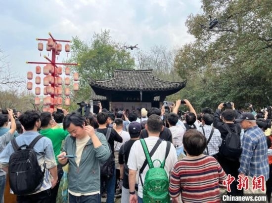 游客在西溪深潭口古戲臺(tái)觀看花朝節(jié)相關(guān)儀式。 王題題 攝