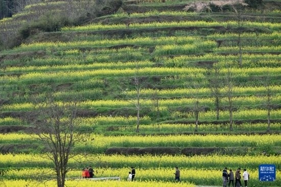 3月27日,游客在黃山市徽州區(qū)呈坎鎮(zhèn)靈山村的梯田油菜花海游玩。