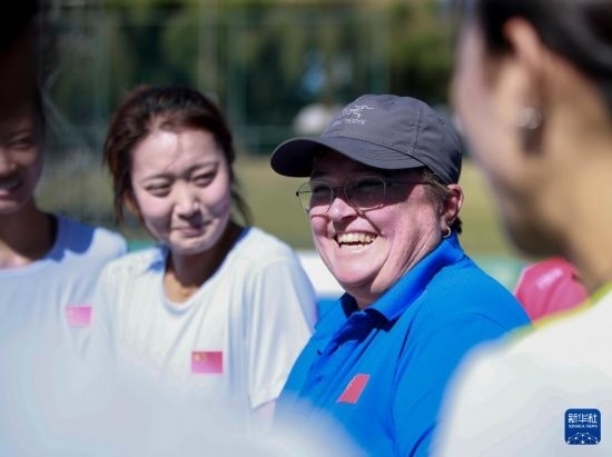 4月26日,中國女曲隊主教練安南(右二)在訓(xùn)練中與隊員溝通。新華社記者 馬平 攝