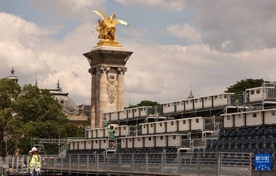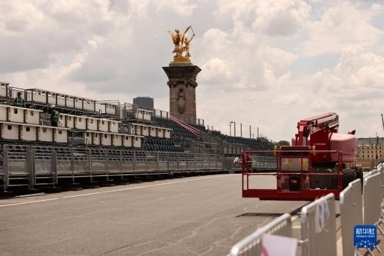 這是6月4日在位于法國巴黎市中心的亞歷山大三世橋拍攝的臨時比賽場地搭建現(xiàn)場。這里將是巴黎奧運會多個比賽項目的終點,包括公路自行車個人計時賽、游泳馬拉松、鐵人三項比賽。新華社記者 高靜 攝
