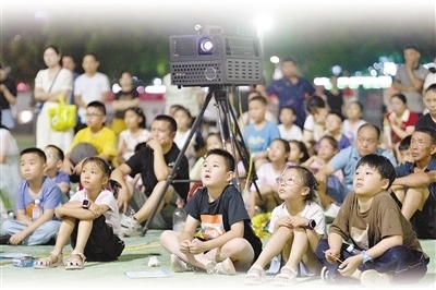近日,在湖北省襄陽市??悼h體育場,孩子們在觀看電影。楊 韜攝(人民視覺)