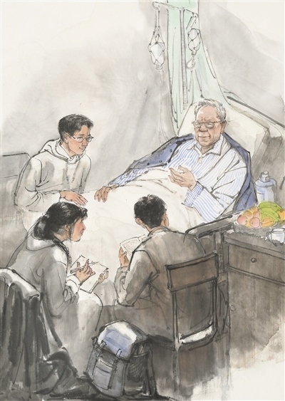 人民教師勤學(xué)篤行、求是創(chuàng)新的躬耕態(tài)度,給無數(shù)人以榜樣的力量,也給美術(shù)創(chuàng)作以靈感?!叭嗣窠逃摇眹覙s譽(yù)稱號獲得者衛(wèi)興華,終其一生都奮斗在勤學(xué)求真的道路上。90余歲時,即使病痛纏身,他仍堅持每天學(xué)習(xí)、工作。有感于衛(wèi)興華教授的敬業(yè)精神,高毅特意描繪了臥病在床的衛(wèi)興華堅持與學(xué)生探討學(xué)術(shù)課題的場景,主人公那專注的神情令人動容。像衛(wèi)興華這樣堅守耕耘的教師還有許多。劉昌明水彩畫《一個教師的工作臺》便以細(xì)致的場景描繪表達(dá)出對教師群體的敬意。貼著泛黃舊紙的墻面、藥瓶和墨水瓶之間的教案、脫漆的木桌、一副老花眼鏡……畫家在此調(diào)動了一切能夠反映老一輩教育者辛勤伏案的元素,象征著沒有直接出場的教師形象?!按颂師o聲勝有聲”的表達(dá)效果,令人回味無窮。