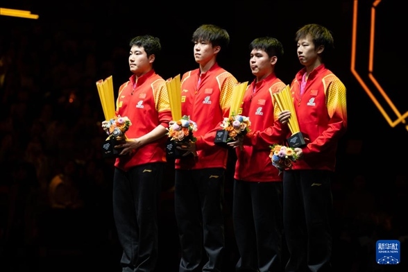 10月5日,冠軍王楚欽(左二)/梁靖崑(左一)和亞軍林高遠(yuǎn)(右一)/林詩(shī)棟在頒獎(jiǎng)儀式上。新華社記者 肖藝九 攝
