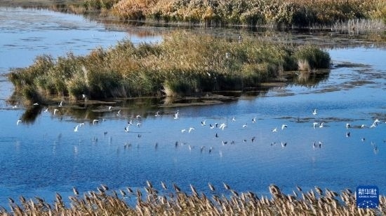 10月14日在居延海景區(qū)拍攝的水鳥(無人機(jī)照片)。