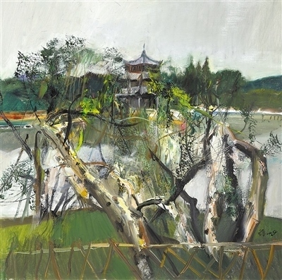 油畫(huà)《臨海東湖》,作者楊參軍。