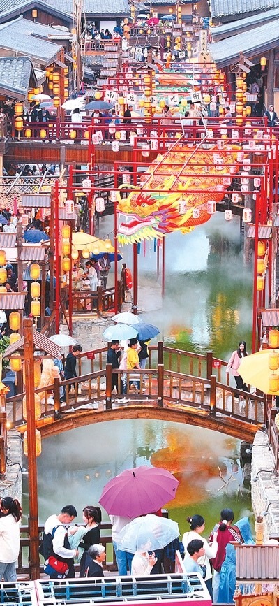 龍門浩老街上,幾名外地游客沿著青石臺階漫步至老街最高點(diǎn)——攬?jiān)屡_,遠(yuǎn)眺渝中半島。這條位于重慶市南岸區(qū)南濱路中段的老街,面朝長江,背依南山,開埠文化、巴渝文化等文化底蘊(yùn)深厚。近年來,經(jīng)過保護(hù)與修繕,這里不僅恢復(fù)了歷史風(fēng)貌,還增添了現(xiàn)代時尚氣息。古色古香的街道兩旁,新潮的商鋪、餐館和咖啡館為市民游客休閑購物提供便利和全新體驗(yàn)?!案惺軙r光交錯的美妙”,成為這里的一大魅力。數(shù)據(jù)顯示,自發(fā)展全域旅游以來,龍門浩老街所在的龍門浩街道已接待游客近4000萬人次,實(shí)現(xiàn)旅游收入276.8億元,龍門浩老街還成功創(chuàng)建第二批國家級夜間文旅消費(fèi)聚集區(qū)。