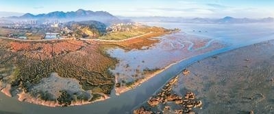 圖為閩江入海口廣闊的灘涂、被稱(chēng)為“閩江口明珠”的瑯岐島以及日益繁榮的城鎮(zhèn)。