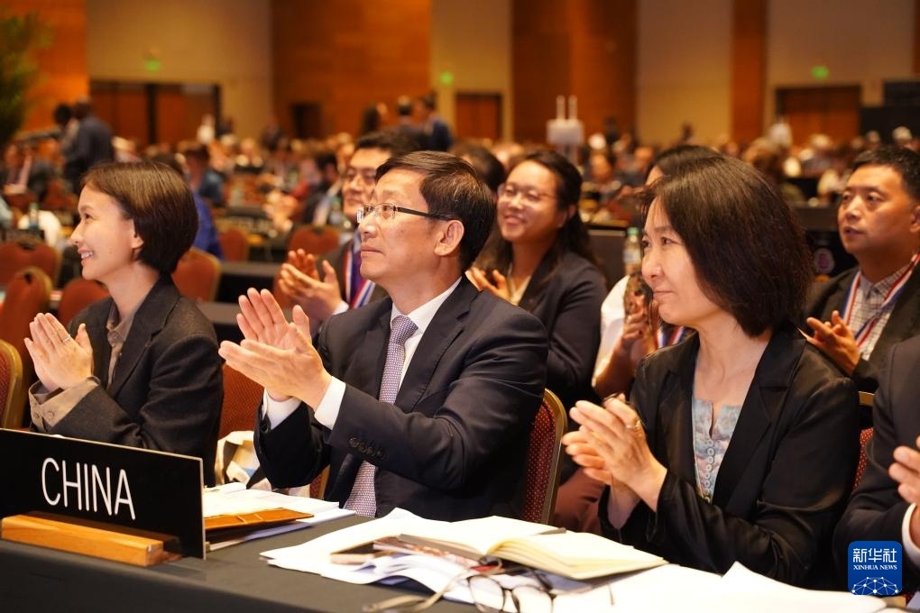 12月5日,在巴拉圭亞松森聯(lián)合國(guó)教科文組織保護(hù)非物質(zhì)文化遺產(chǎn)政府間委員會(huì)第19屆常會(huì)評(píng)審現(xiàn)場(chǎng),中國(guó)代表團(tuán)慶祝。新華社記者 朱雨博 攝