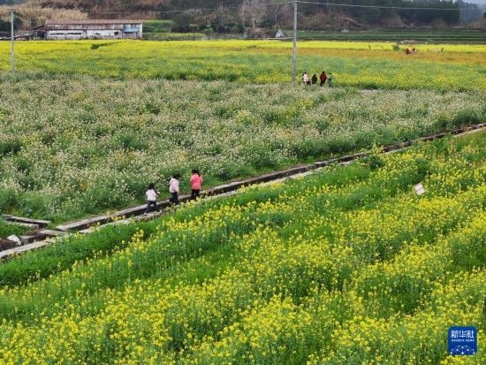 3月8日,游客在廣西恭城瑤族自治縣栗木鎮(zhèn)觀賞油菜花。