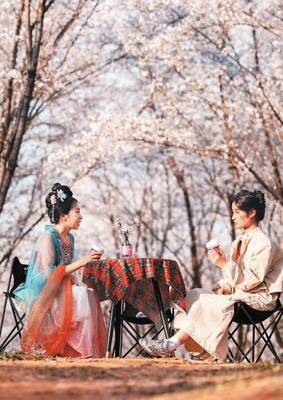 新和村千余畝櫻花絢爛綻放,游客在花海中體驗(yàn)“村咖”。