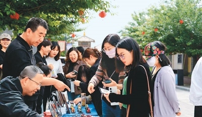游客在六營村欣賞泥塑作品。