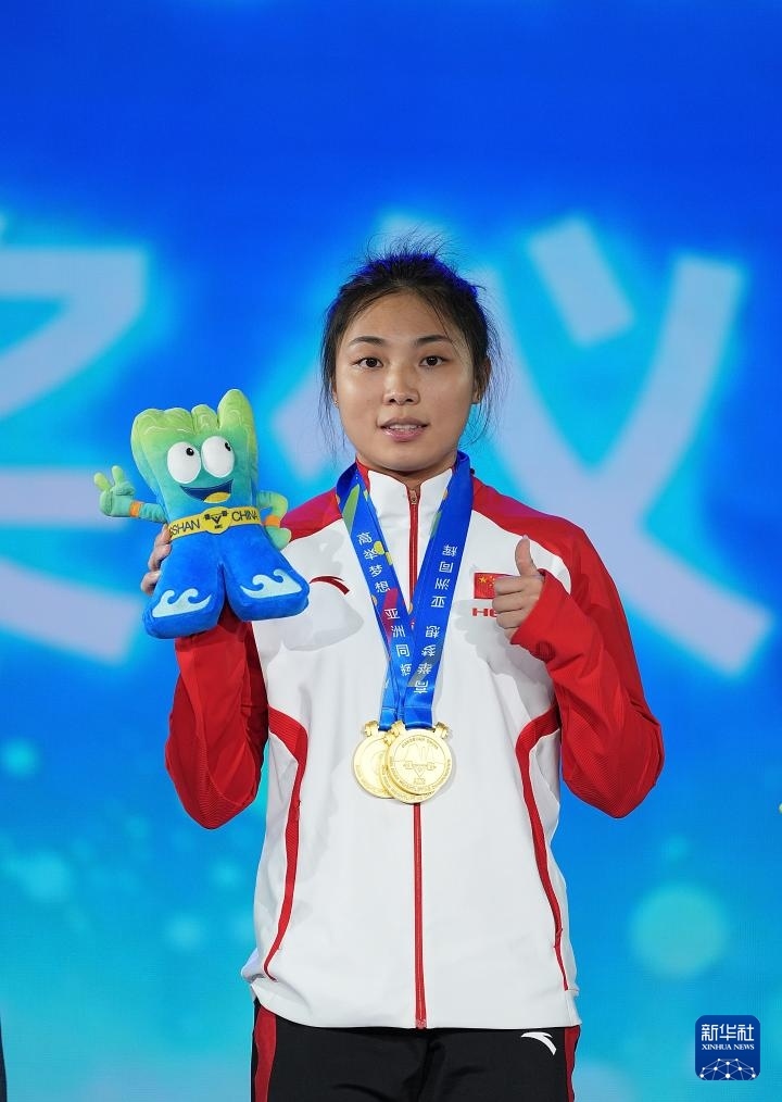 5月10日,中國選手張海琴在頒獎儀式上。最終,她獲得抓舉、挺舉、總成績?nèi)?xiàng)冠軍,并打破這三項(xiàng)世界青年紀(jì)錄。新華社記者 侯昭康 攝