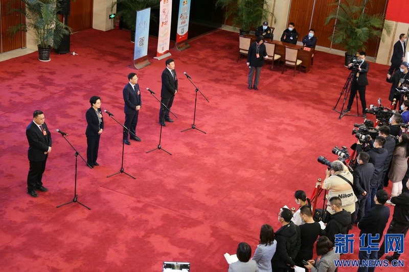 媒體記者在“代表通道”上提問。新華網 曹楨攝
