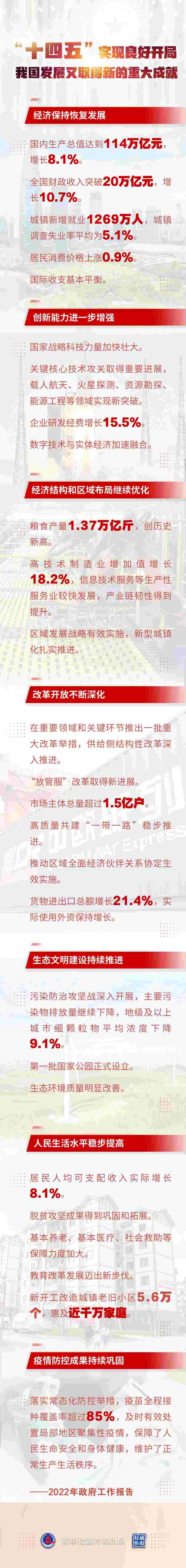——改革開(kāi)放不斷深化。在重要領(lǐng)域和關(guān)鍵環(huán)節(jié)推出一批重大改革舉措,供給側(cè)結(jié)構(gòu)性改革深入推進(jìn)?!胺殴芊备母锶〉眯逻M(jìn)展。市場(chǎng)主體總量超過(guò)1.5億戶。高質(zhì)量共建“一帶一路”穩(wěn)步推進(jìn)。推動(dòng)區(qū)域全面經(jīng)濟(jì)伙伴關(guān)系協(xié)定生效實(shí)施。貨物進(jìn)出口總額增長(zhǎng)21.4%,實(shí)際使用外資保持增長(zhǎng)。