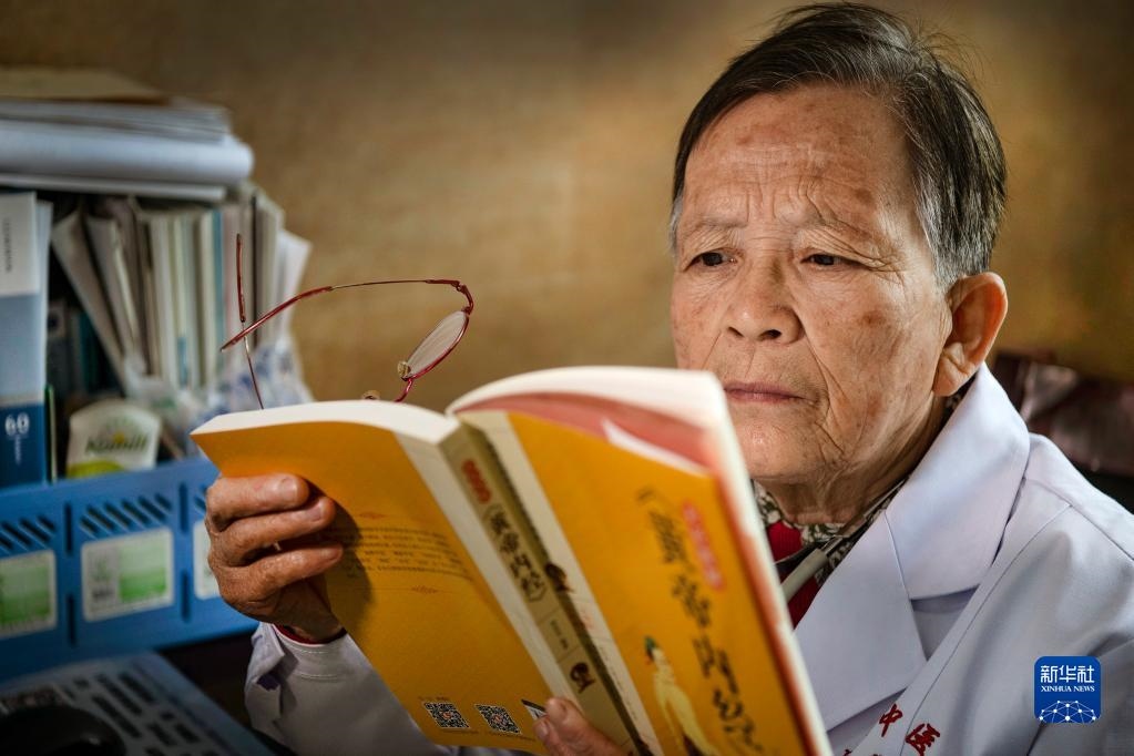 在陜西佳縣中醫(yī)院門診義診的路生梅,沒(méi)有病人時(shí)堅(jiān)持看書(shū)學(xué)習(xí)(2020年4月8日攝)。新華社記者 陶明 攝