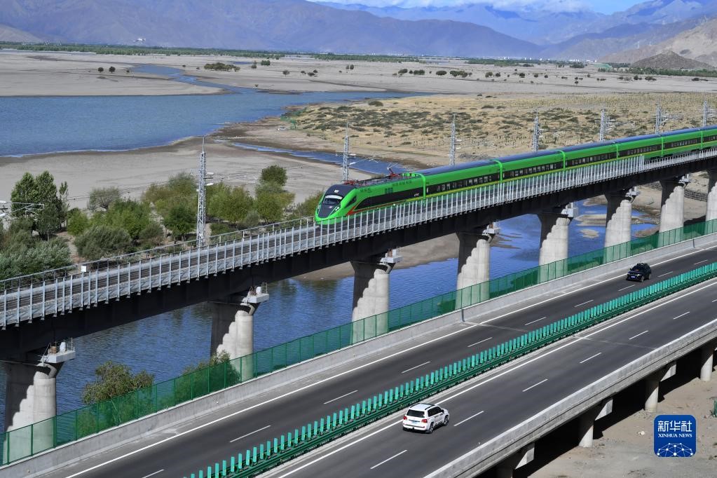 試運行的復興號列車行駛在雅魯藏布江畔(2021年6月16日攝)。新華社記者 覺果 攝