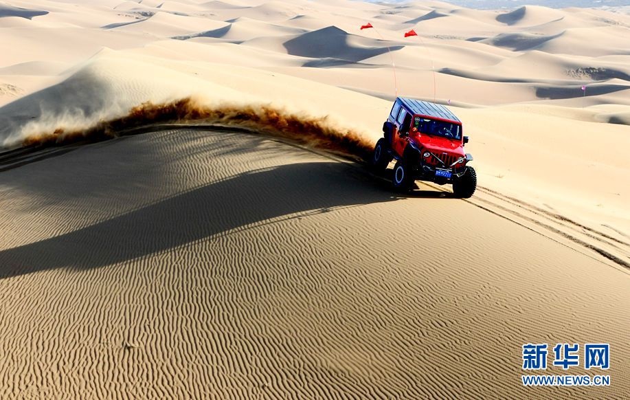4月26日,汽車運動愛好者在騰格里沙漠腹地駕車馳騁。